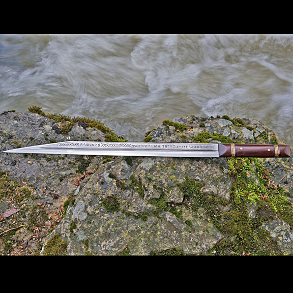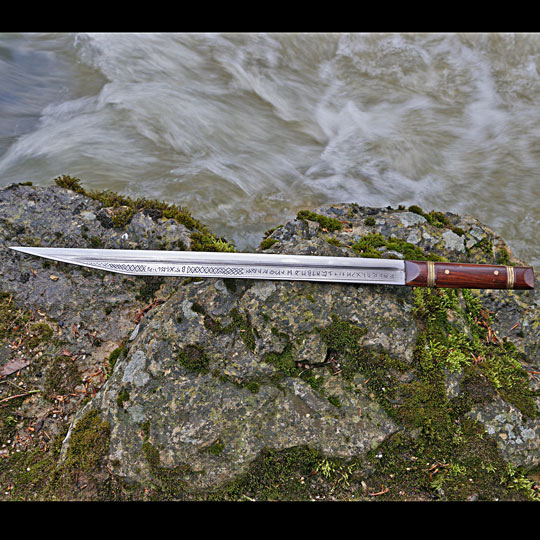 - Die Klinge ist aufwendig graviert und mit einer runischen Inschrift versehen, wobei der erste Teildas angelsächsiche Futhorc (= Alphabet) wiedergibt.