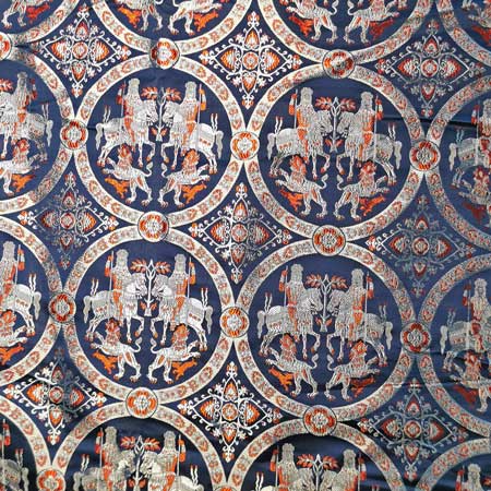 - Die allgemeine Zusammensetzung der Dekoration ist ein Hybrid zwischen der Jagdszene vom Typ Bahram Gur (bestehend aus zwei Reitern, Beute sowie Hunden oder Löwen, die symmetrisch um einen Baum des Lebens angeordnet sind) und den Seidenbrokaten. “bekannt als “”den Kaisern””.” Diese Brokat zeigt byzantinische Herrscher.